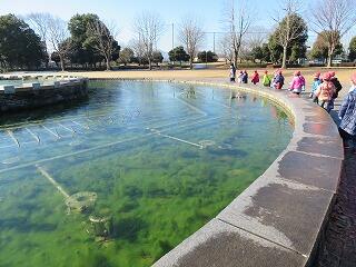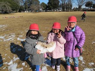 公園では、葉が落ちた木々や水が凍った噴水、鴨などを見て、改めて冬を感じた様子でした。先週降った雪が残っている場所もあり、子どもたちはとても喜んでいました。