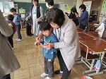 子どもたちは、生命が誕生した時の大きさは、針の先で穴を開けたのと同じ大きさであることを聞くと、その小ささにとても驚いていました。(左の写真は、穴を開けた画用紙を光にかざして、たまごの大きさを実感している様子です。)