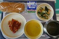 <今日の給食> ご飯・牛乳・ユウリンチー・キムチ和え・とうもろこしと卵のスープ