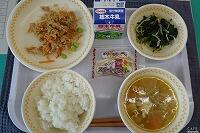 <今日の給食> ご飯・牛乳・チンジャオロースー・中華サラダ・ワンタンスープ