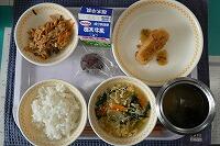 <今日の給食> ご飯・牛乳・豚肉とさつまいものかりん揚げ・ほうれん草のおひたし・白菜と厚揚げの味噌汁