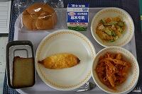 <今日の給食> ミルクコッペパン・牛乳・モロフライトマトソース・ほうれん草とコーンのサラダ・カボチャのポタージュ