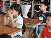 子どもたちは、実際にうづま荘で行われているズンドコ体操と嚥下(えんげ)体操を体験しました。