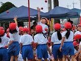 1、2年生が協力して大空めがけて赤白の玉を投げ合いました。