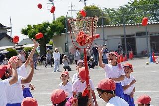 1・2年生の「玉入れ」の様子です。みんなで力を合わせたので、たくさん玉が入りました。