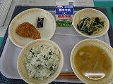 <今日の給食> わかめご飯・牛乳・モロのフライ・ソース・小松菜のおひたし・根菜のごま汁