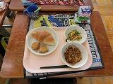 今日のメニューは、減塩バターロールパン、牛乳、焼きそば、たこナゲット、小松菜のごま醤油あえです。