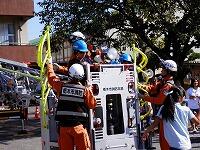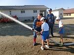 その後、心肺蘇生法、はしご車、消火器による消火等の体験をし、消防団の放水を見せていただきました。