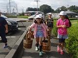 消防団の方の実際の消火訓練も見せていただきました。間近で聞くサイレンの音や、ホースから出る水の勢いに子どもは驚いていました。