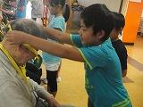 利用者のおじいさんおばあさんとじゃんけんをして交流しました。自己紹介をしたり自分たちで作ったメダルをプレゼントしたりしました。