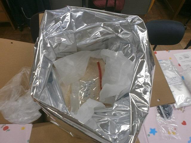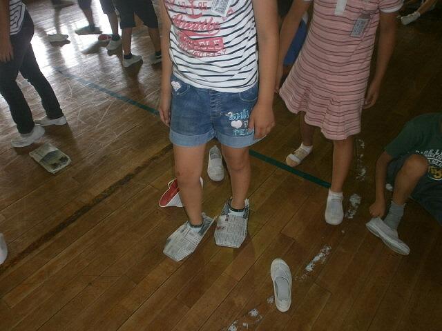 新聞紙スリッパは1~6年生。ゴミ袋カッパは3~6年生。簡易マスクは5~6年生が作りました。
