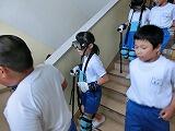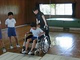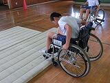 まず最初に、自力で狭い道を通って段差を上る体験をしました。段差はあまり高くないものでしたが、上ることができない児童がたくさんいて、車いすの大変さに気付くことができました。