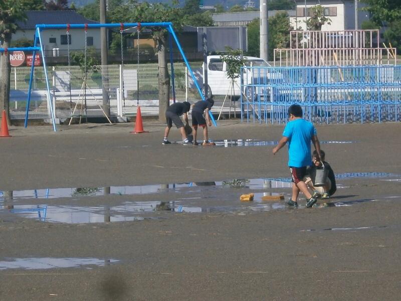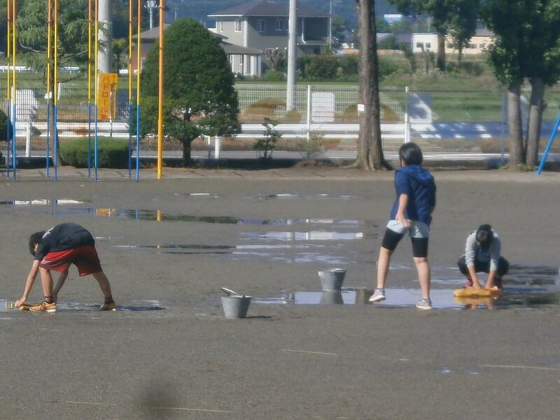 少しでも早く校庭が乾いて、みんなに遊んでもらえるようにがんばっています。