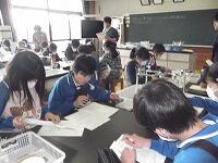 授業は、紫キャベツを煮だした液を入れて、いろいろな水溶液の色の変化を観察し、酸性、アルカリ性、中性を調べる内容でした。子どもたちは、とても興味深そうに実験に取り組んでいました。楽しい授業、先生の温かな声掛けに、中学校への期待がさらに高まったようです。