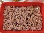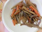 明日の卒業を祝っての献立です。メニューは、赤飯、鶏肉の唐揚げ、五目きんぴら、湯葉のすまし汁、お祝いケーキ、牛乳です。