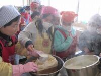 鍋でよく熱したものを袋に入れて絞ります。ここで豆乳とおからに分かれます。初めておからを触った、初めておからを見たという子どももいました。
