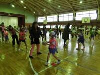 チームのみんなで手をつなぎ、風船を落とさないようにパスします。なかなか上手です。