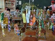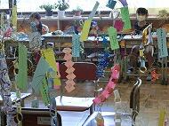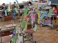 今日は端午の節句などと同じ五節句の一つ七夕。24節気の小暑。3年生は、短冊に願いを書いて笹竹を飾り、七夕給食を楽しんでいます。図書室の入り口にも飾りが。 給食には織り姫と彦星をイメージしたデザートや星マークのなるとが出ました。