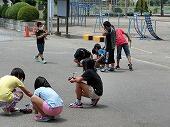 太陽発電で車を動かす理科の授業です。梅雨の晴れ間、太陽の下でモーターを動かす4年生です。リード線の接触、小さなギヤなどの問題でうまく動かない車も…。頑張れ。