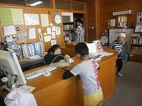 図書委員さんのお仕事は、おもに図書室のカウンターで図書の返却と貸出、パソコンを利用して、みつけてほしい図書の検索を行っています。