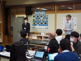 理科室に教員が集まり研修開始 グループごとに課題の送付・提出の手順を体験