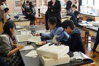 理科で顕微鏡を使い、火山灰の観察をしました。理科室での授業の様子を参観していただきました。