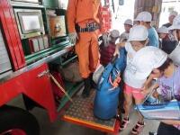 栃木市消防署では、初めにビデオを見て消防の仕事について学んだ後、実際に消防自動車や救急車を見せていただきました。また、通信指令センターの説明を聞いたり、代表で数名、はしご車に乗せてもらったりもしました。