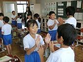 じゃんけんで勝った児童が音楽に合わせて太鼓をたたきました。代表になれなかった児童も退場の際、出口付近に置いた太鼓をたたきました、