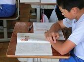手首に重りを付けたり、視野が狭くなる眼鏡をかけたりしながら高齢者体験をしました。教室では、国語の教科書を音読したり自分の名前をノートに書いたりして、普段の感覚との違いを体験することができました。