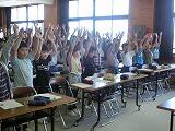 次に、交通安全に関する問題をクイズ形式で考えました。児童は、紅白帽子を使って選択問題に答えました。正解が発表されるたびに一喜一憂しました。