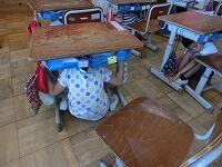 いよいよ避難訓練開始です。緊急地震速報のチャイム音を聞いて、一時避難します。何度かショートの避難訓練を重ねてきたので、これは比較的静かに、スムーズに行うことができました。その後、大地震が発生し、揺れが収まるのを机の下で待ちました。長い時間静かに待つのは、特に低学年にはちょっと難しかったようですが、頑張りました。