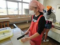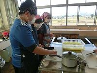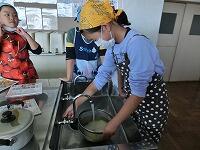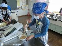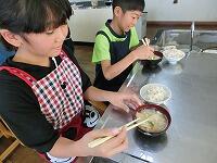 5年生は家庭科の時間に、ごはんとみそ汁を作りました。ごはんは鍋を使い、自分たちで火加減を調節しながら炊きます。みそ汁は煮干しでだしをとり、大根、油揚げ、ネギを入れます。班の友達と協力しながら、一生懸命作ることができました。