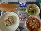 <今日の給食> ご飯・牛乳・モロのケチャップソース・五目きんぴら・豆腐とわかめの味噌汁