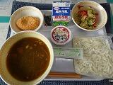 <今日の給食> カレーうどん・牛乳・野菜コロッケ・トマトサラダ・シモンちゃんいちごゼリー