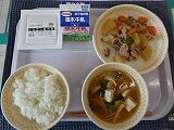 <今日の給食> ご飯・牛乳・豚肉と大根のうま煮・かんぴょうの味噌汁・栃木市産麦納豆
