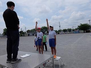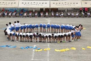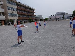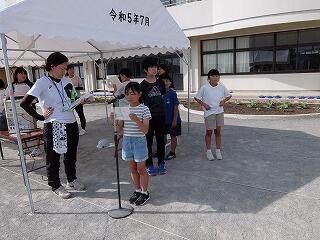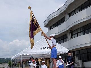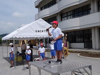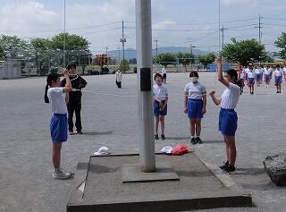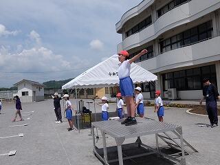 運動会に向けて、徒競走・ダンス・玉入れ・綱引きなどの演技種目の練習が進められています。それと並行して高学年児童(特に6年生)は各種係活動の練習にも取り組んでいます。今回は開会式等での6年生の練習の様子を紹介いたします。