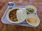 今日は、とち介ランチです。今日のビーフカレーは、栃木農業高校のおいしい牛肉を使っています。もち麦も栃木農業高校産、米、にんにくは栃木市産です。今週は栃木市や栃木県の食材をたくさん使いました。地産地消のよさについて、考えてみましょう。
