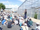 お話後には、ビニールハウスの中に入らせていただき、実際にいちごを手に取ったり食べたりしました。児童は笑顔で「おいしい」「甘い」と話していました。