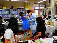 実際に、子どもたちが学校で吐いてしまった時を想定し、身支度、消毒液のつくりかた、ふき方等やってみました。一つ一つ気を付けないと、流行に繋がってしまうことが分かりました。