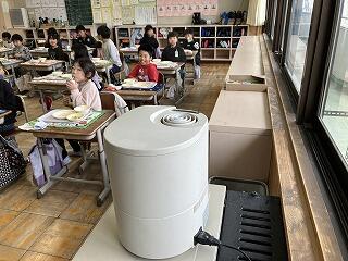 先週までは、インフルエンザによる学級閉鎖になっているクラスもありましたが、今週になりすべて解除になりました。インフルエンザによる出席停止・学級閉鎖で登校できない児童はピーク時(11月21日)は72名でしたが、昨日(12月2日)は、3名までに減少しました。しかし、感染症予防対策を継続して進めています。その主なものは、換気・加湿・手洗いです。これらの様子を紹介いたします。