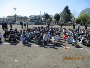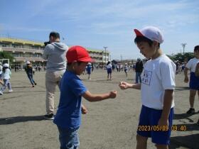 6年生とのスポーツ交流会、6の1男子対5の1男子、6の2男子対5の2男子、6の3男子対5の3男子