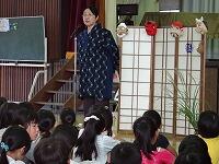 錦着山に伝わる埋め太鼓のお話や「おどるガイコツ」「「三枚のお札」というお話を、軽妙な語り口で話してくださいました。