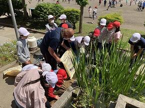 校舎前の池の周りに、5年生が「稲」を植えました。
