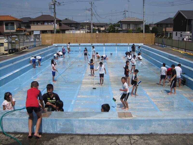 丁寧に、プールの床を磨きました。汗をたくさんかきながらがんばりました。