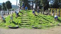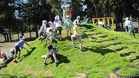 早速昼休み、大勢で、芝の上を滑ったり、転がったりする楽しそうな子どもたちの姿を多く見ることができました。このひょうたん島は、創立60周年を記念して5年前に作られた物です。
