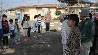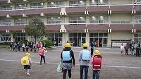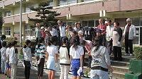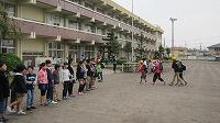 校庭に避難した後、校長先生より、お話をいただきました。地震や火事は、学校だけでなく、