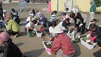 あいさつの後、シニアクラブから寄贈していただいたパンジーの苗を協力して