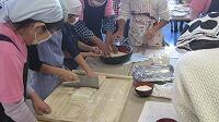 14名の方々の指導でそば粉をこね、麺を伸ばし、包丁で切りました。初めての3年生も真剣に上手にできました。