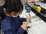 先生が食紅で色をつけた水につけておいた切り花を使いました。茎をカッターで薄く切って、プレパラートにのせます。顕微鏡の使い方は5年生で学習していたので上手に使っていました。