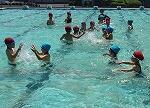 準備運動や水慣れをしたあと、いよいよプールに入りました。深さにちょっと驚いた子もいましたが、水をかけあったり、おにごっこをしたりするうちに楽しさが増していきました。